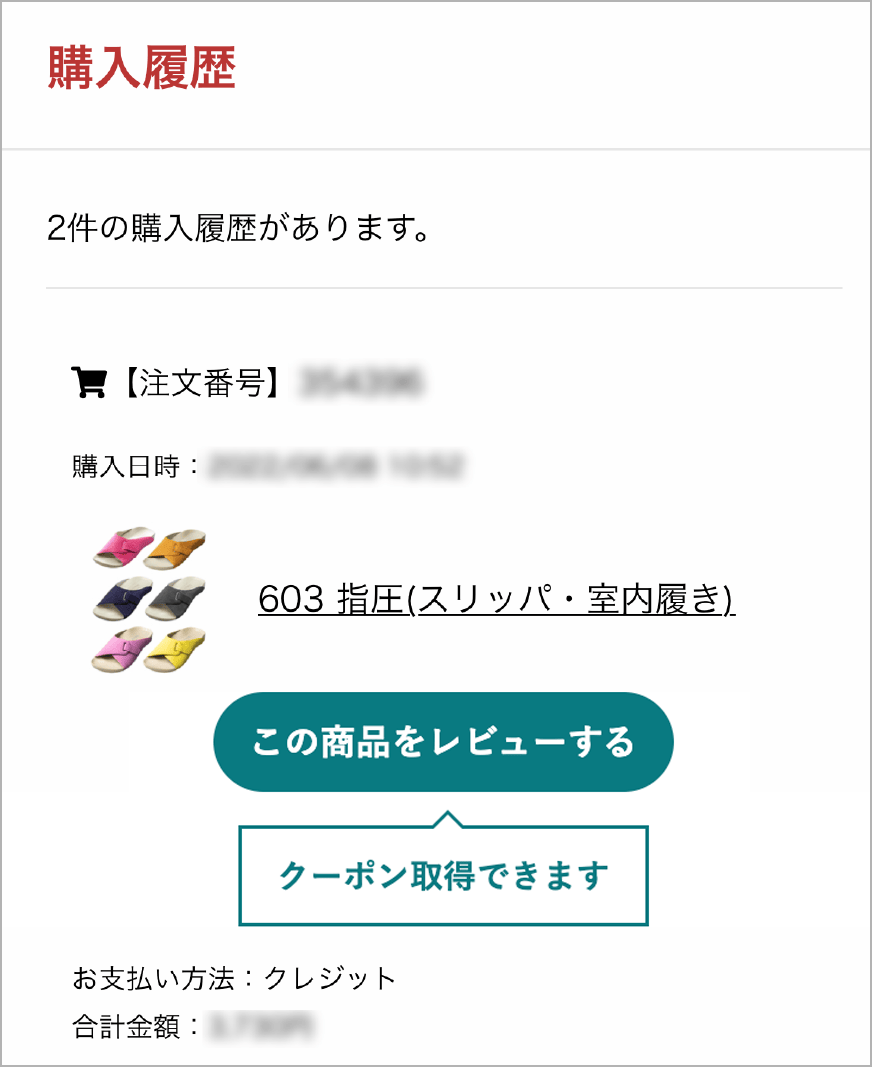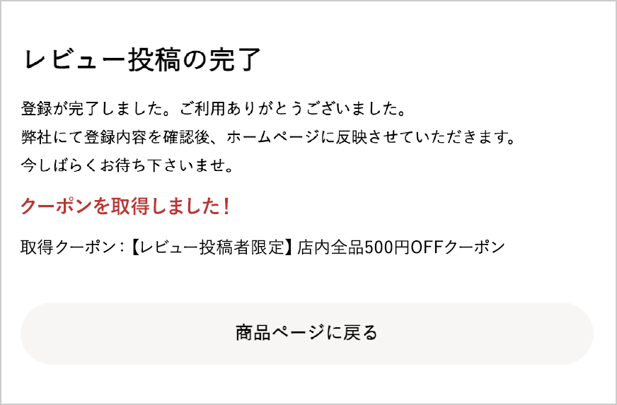 - クーポンはお客様がレビュー投稿を完了した時点で、即自動付与されます。