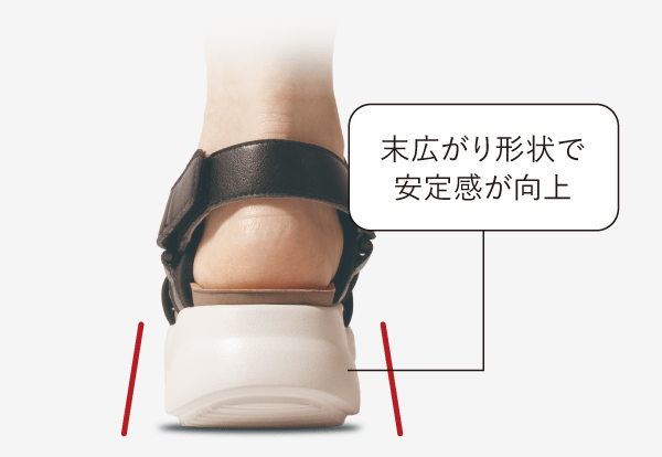 ヒールを下に向かって広がる形状にすることで接地面を広げ、厚底特有のぐらつきを抑え、歩行時の安定感が向上。
