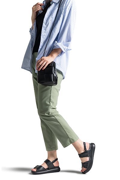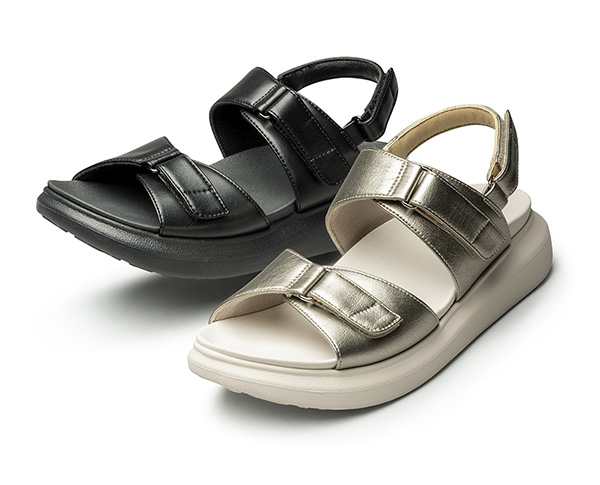 硬度の異なるEVAをインソールとアウトソールに採用。柔らかな足当たりと歩きやすさを両立する工夫を施しました。足裏の荷重をバランスよく分散し、土踏まずや足指付け根への負担を和らげます。さらに、足裏にフィットする設計で圧迫や摩擦を軽減し、快適な履き心地をサポートします。