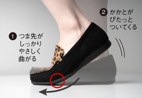 歩行中に靴が足の動きに合わせて正しく屈曲することで、かかとが浮きにくく、歩き始めから終わりまでなめらかな足運びが続きます。ボロネーゼ製法を採用し、歩きやすさを徹底的に追求しました。