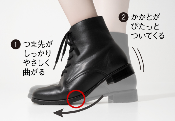 熟練職人が、一足一足丁寧に仕上げています。袋のように足を包み込み屈曲性の良い『ボロネーゼ製法』を採用しているため、歩行の動きに合わせて、靴が正しい位置で曲がるから、足運びはとてもなめらかです。