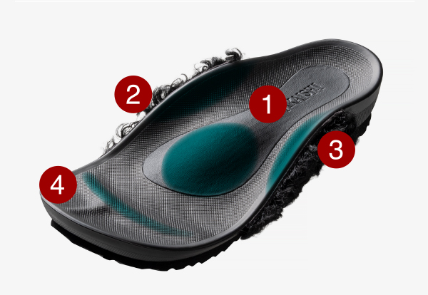 足裏にある3つのアーチに沿って設計された立体インソールが、ぴたっとフィットして支えるから、履いた瞬間から心地よさを実感。それぞれのアーチをサポートする凹凸が足裏に心地よい刺激を与えて、疲れをほぐします。