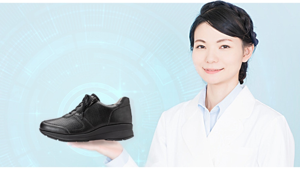 かかと着地から足指で蹴り出すまでの重心移動が正しく行えるようにインソールがガイド。また足首が左右に傾くのを防ぐ構造により歩行を安全にします。