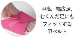 甲に入った縦スリットとベルトで、甲の高さや足幅に合わせて調整ができるから、「履き口が食い込んで痛い!」など足の形が原因でお悩みの方におすすめ。