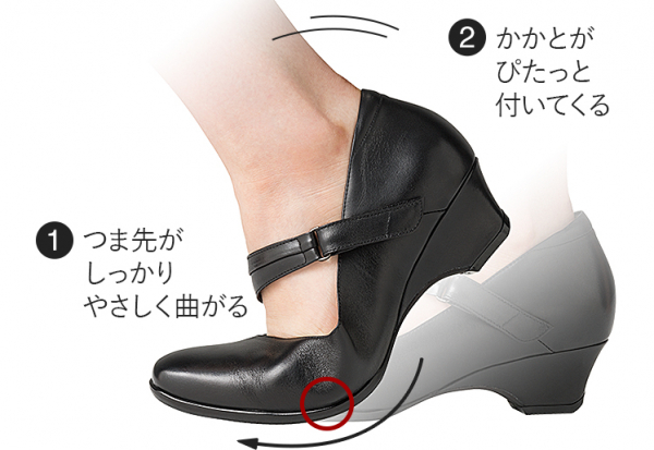 歩行の動きに合わせて、靴が正しい位置で曲がるから、足運びはとてもなめらか。そして何より、かかと脱げしません。ヒールでも歩きやすさを極限まで高めた、袋製法と蹴り出しアシストソールの組み合わせ。