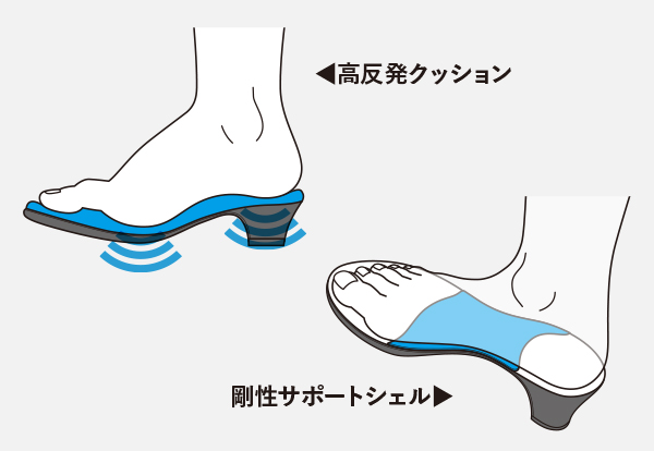 高反発クッションが路面からの衝撃を吸収し、足裏表面のタコ、ウオノメから保護します。また、剛性サポートシェルが左右のグラつきやブレを防止し、姿勢を安定させます。
