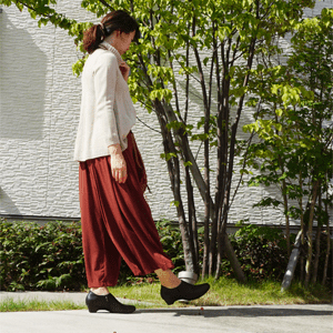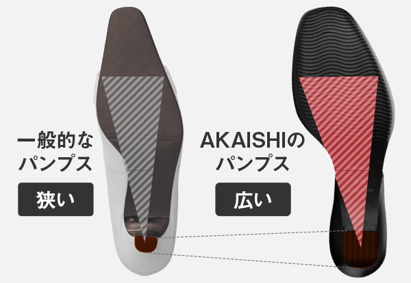 安定歩行のカギは体重の1.5倍もの衝撃がかかる一歩一歩を、ぶれたり捻れたりすることなく受け止めることにあります。足を支える面積が一般的なパンプスより広く、ヒールの幅も大きいため重心が安定します。