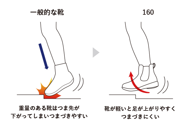 • 軽量設計だから、疲れた時でもつま先が楽に上がり、段差でのつまずきを防ぎます。また、靴底がロッカー形状になっていることで踏み返しが楽に、スイスイ歩けます。
