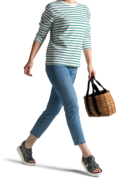 硬度の異なるEVAをインソールとアウトソールに採用。柔らかな足当たりと歩きやすさを両立する工夫を施しました。足裏の荷重をバランスよく分散し、土踏まずや足指付け根への負担を和らげます。さらに、足裏にフィットする設計で圧迫や摩擦を軽減し、快適な履き心地をサポートします。