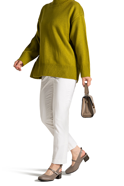 安定歩行のカギは体重の1.5倍もの衝撃がかかる一歩一歩を、ぶれたり捻れたりすることなく受け止めることにあります。足を支える面積が一般的なパンプスより広く、ヒールの幅も大きいため重心が安定します。