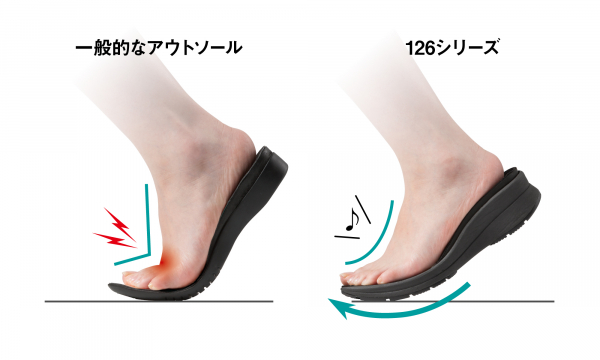 一般的なアウトソールでは、蹴り出し時に母趾を曲げるため、つま先に負担がかかっていました。126シリーズのアウトソールなら、転がるように蹴り出せるので母趾を曲げずに歩けます。