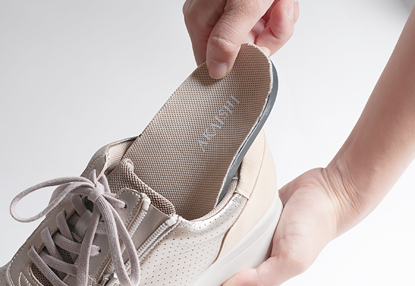 曲がった母趾をやさしく補正する、母趾外転筋サポートのインソールで、歩行時に母趾と足裏にかかる負担を軽減します。