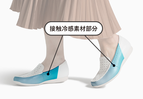 靴の内側には、触れた瞬間にひんやりして心地よい「接触冷感素材」を採用。吸水性と乾きやすさに優れ、ムレを感じにくいので、さらっと快適な履き心地が続きます。 -
