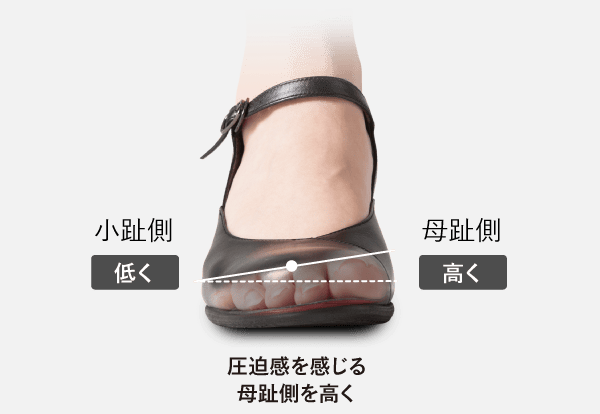 トゥボックス(つま先が収まる部分)は母趾側にゆとりを持たせたつくり。外反母趾の方も窮屈さを感じにくい設計です。
